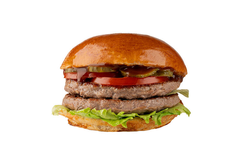 Булочка бріош, подвійна котлета з яловичини, авторський соус барбекю, авторський часниковий соус, салат айсберг, стиглі томати та маринований огірок