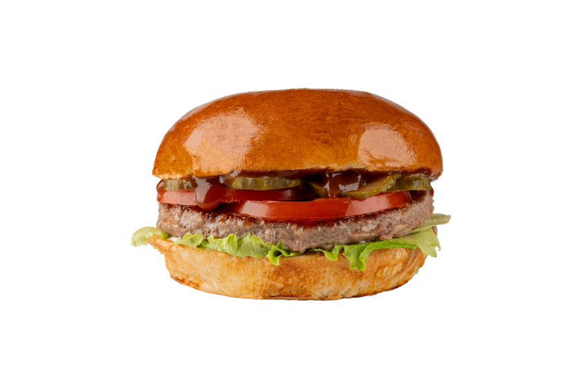 Булочка бріош, котлета з яловичини, авторський соус барбекю, авторський часниковий соус, салат айсберг, стиглі томати та маринований огірок