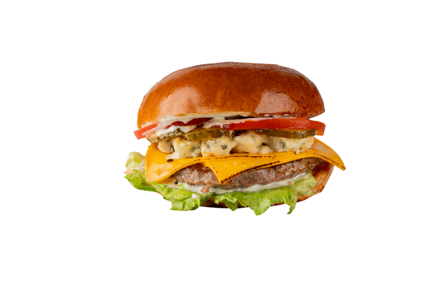 Булочка бріош, котлета з яловичини, авторський часниковий соус, подвійний сир чедер, сир дор блю, салат айсберг, стиглі томати та маринований огірок
