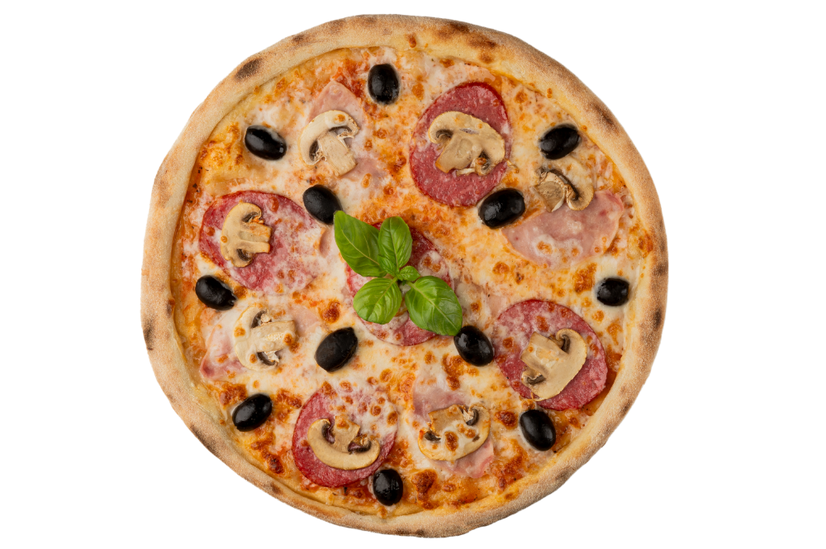 Авторський томатний соус, вершкова моцарела, салямі, шинка, гриби та маслини