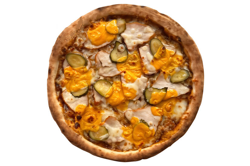 Авторський соус BBQ, ніжне куряче філе, вершкова моцарела, маринований огірок, маринована цибуля та сир чедер